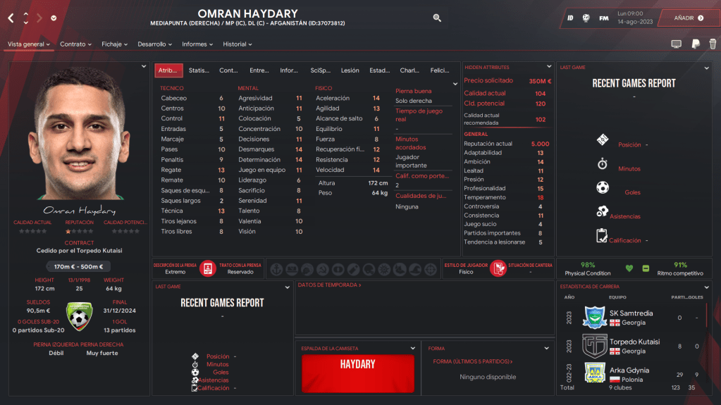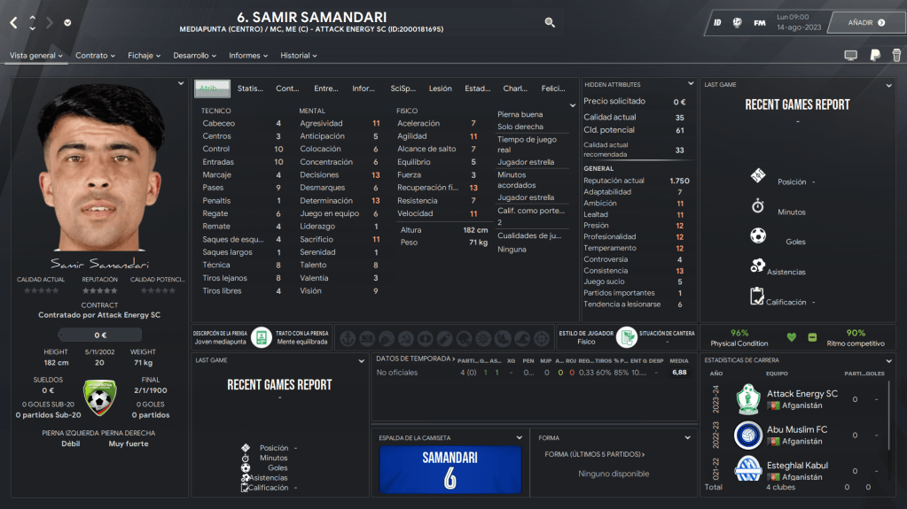 La partida que yo seleccioné en Primera División es el Attack Energy de la ciudad de Herat, que tiene jugadores cargados (y eso es mucho lujo). Fundado en el año 1947, ha sido campeón regional y campeón nacional ya dos veces: en 2022 y 2024. El volante, Samir Samandari de 20 años (de aportes) es la clave del equipo