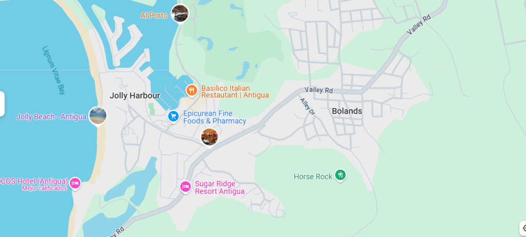En el centro de la isla hacia el Caribe encontramos la localidad de Jolly Harbour, siendo un centro hotelero alternativo a Dickinson Bay que además cuenta con puerto deportivo, restaurantes y servicios. Dos playas muy conocidas de Antigua: Hermitage y Ffryes están en el ámbito urbano de Jolly Harbour