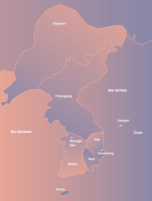 Con la caída de Gojoseon, se establecieron tres reinos fuertes y otros estados que rondaban la escena sin mucho peso específico. Goyurjeo en el norte (ocupando la hoy China), Baekje ocupando la costa suroccidental y Silla en la costa suroriental. El rey Jangsu de Silla trasladó la capital a Pyongyang y ocupó la capital de Baekje (la hoy Seúl) en el año 427. Desde allí los tres reinos se ven enfrentados, aunque Goyurjeo tenía como prioridad la defensa del poder chino desde el norte. Silla se alió con la dinastía Tang china y logró derrotar a Baekje y Goyurjeo unificando el reino en el año 676 tras la caída de Pyongyang.