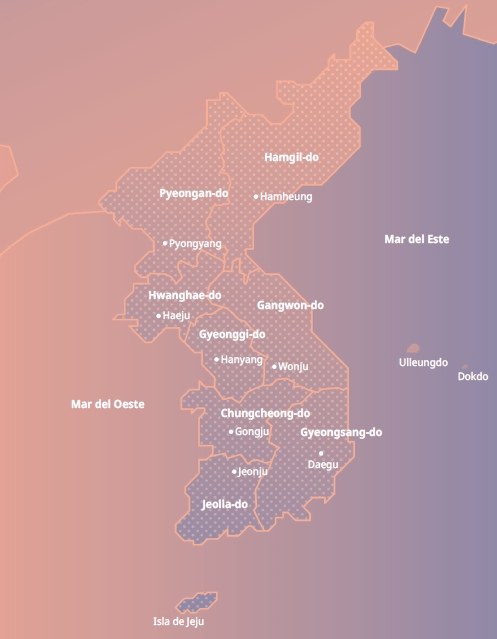 Ahora que terminamos con las ciudades metropolitanas y las especiales, pasaremos a las provincias. Tomaremos un sentido norte-sur desde el oeste para pasar a un sentido sur-norte en el este y finalizar en Jeju.