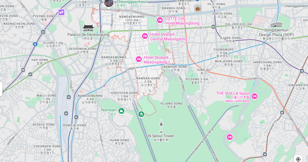 El centro de Seúl está marcado por la estación de tren construída por los japoneses en 1925 y la puerta Sungnyeum que marcaba una de las entradas a la vieja ciudad de Hanyang. Ligeramente hacia el oeste encontramos el distrito de Myeong-dong, centro comercial por excelencia de Seúl. llena de mercados, puestos callejeros y también tiendas de marcas internacionales o el Ayuntamiento de Seúl.