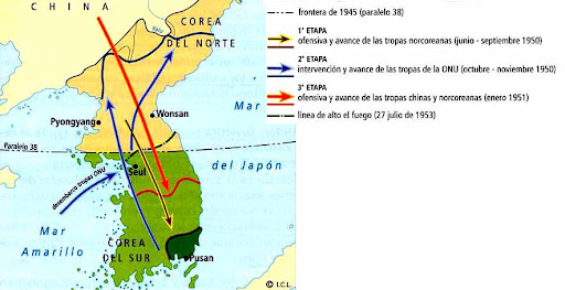 En 1950, cuando el poder de Corea del Sur se vio debilitado por protestas sociales de tinte de izquierda, Corea del Norte cruzó el paralelo 38 llegando en una ola hasta Busan. Estados Unidos junto a otros 16 países entre los que se destaca Colombia, intervienen en la guerra. Las fuerzas del sur tomaron Pyongyang y los estadounidenses querían seguir hasta China, entonces estos intervinieron y tomaron Seúl. EE.UU. solicito usar armamento nuclear contra China pero no vio luz verde y la URSS decidió no intervenir y luego de la muerte de Stalin se estableció un empate técnico y un alto al fuego en el paralelo 38 dividiendo el Norte y el Sur en 1953, aunque nunca se firmó el acuerdo de paz y hoy en día es uno de los puntos más tensos del mundo. Los coreanos se reconocen como un solo pueblo, y la guerra ha separado familias enteras y se arman algunos intentos de reunificación pero las ideologías no permiten esto todavía.