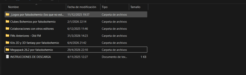 Dentro de Megapack 26.2 verán la carpeta Argentina 2027, dentro de esa carpeta el archivo fmf va en Documentos/Sports Interactive/Football Manager 26/editor data mientras que las carpetas (que son los logos) van en Documentos/Sports Interactive/Football Manager 26/graphics.